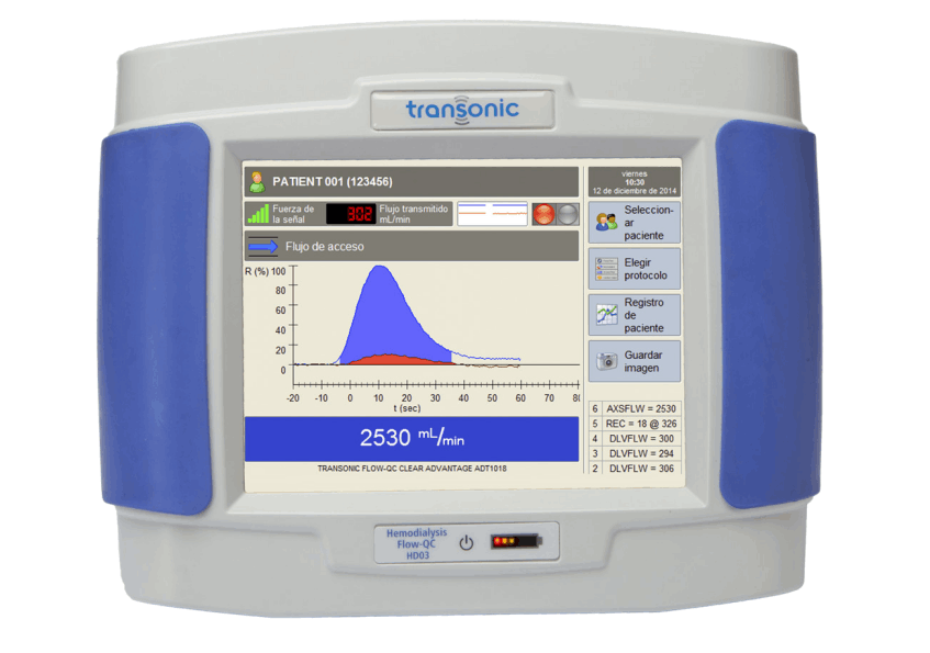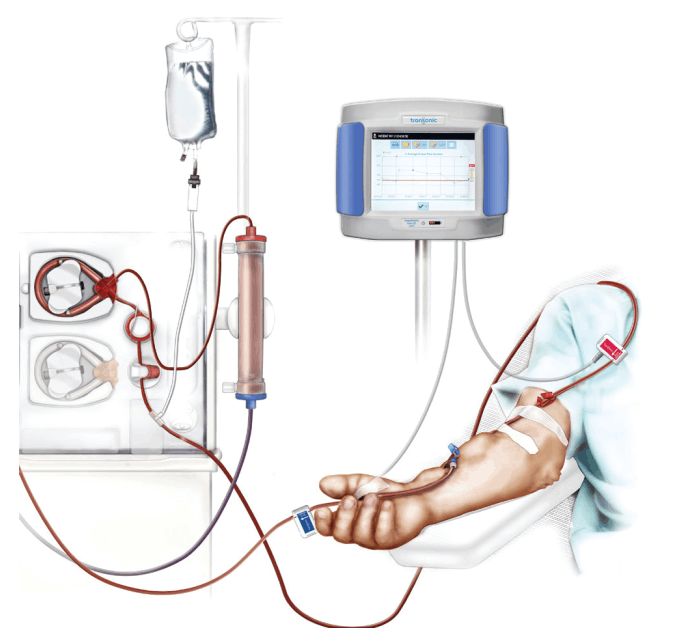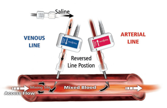 Paired sensors passultrasond waves through dialysis tubing to measure blood flow and other related parameters.
